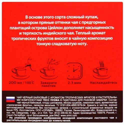 В основе этого сорта сложный купаж, в котором пряные оттенки чая с предгорных плантаций острова Цейлон дополняет насыщенность и терпкость индийского чая. Теплый аромат тропических фруктов вносит в чайную композицию тонкую сладковатую ноту