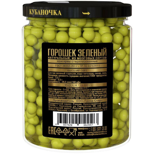 Изготовлен продукт из мозговых сортов зеленого горошка, выращен и собран в России в Краснодарском крае.